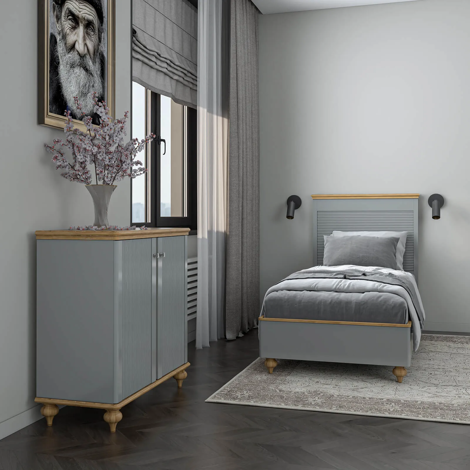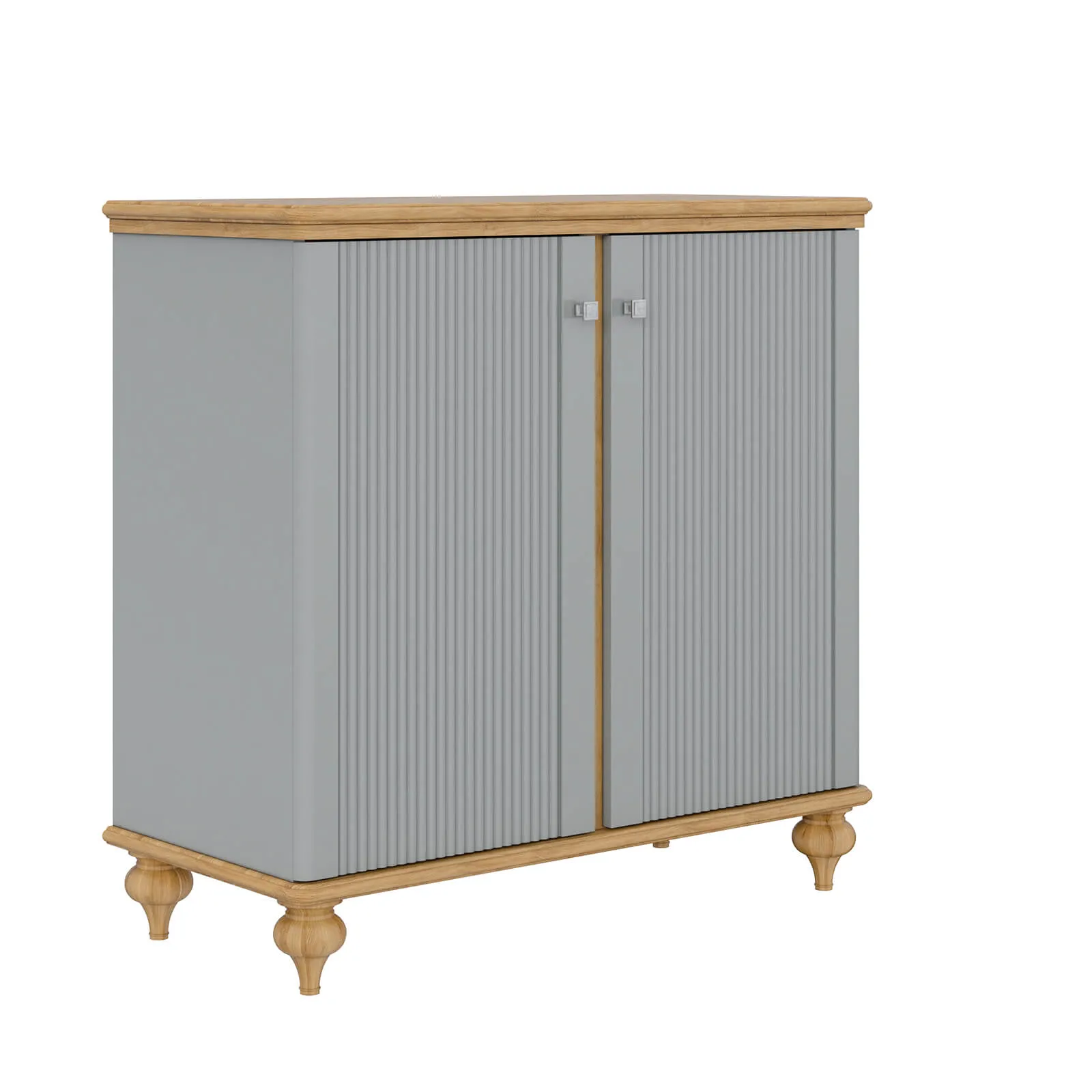 Комод разделен на два отсека, в каждом из которого по одной полке за распашными дверями.