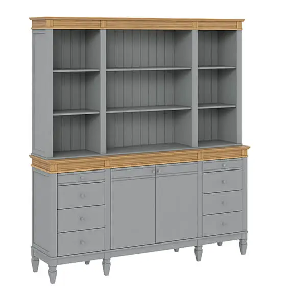 Буфет визуально разделен на 3 секции которые укомплектованы шестью полками сверху,