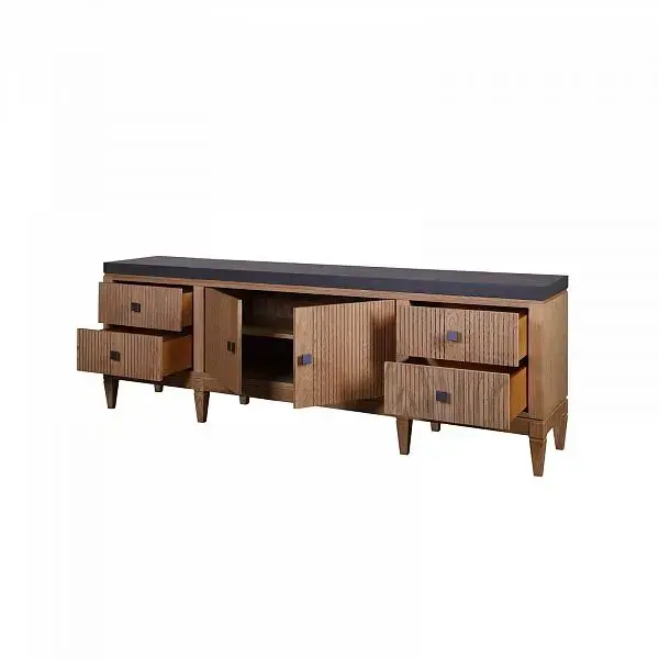 Тумба под телевизор оснащена выдвижными ящиками и дверками. Фурнитура на ящиках с доводчиками.
