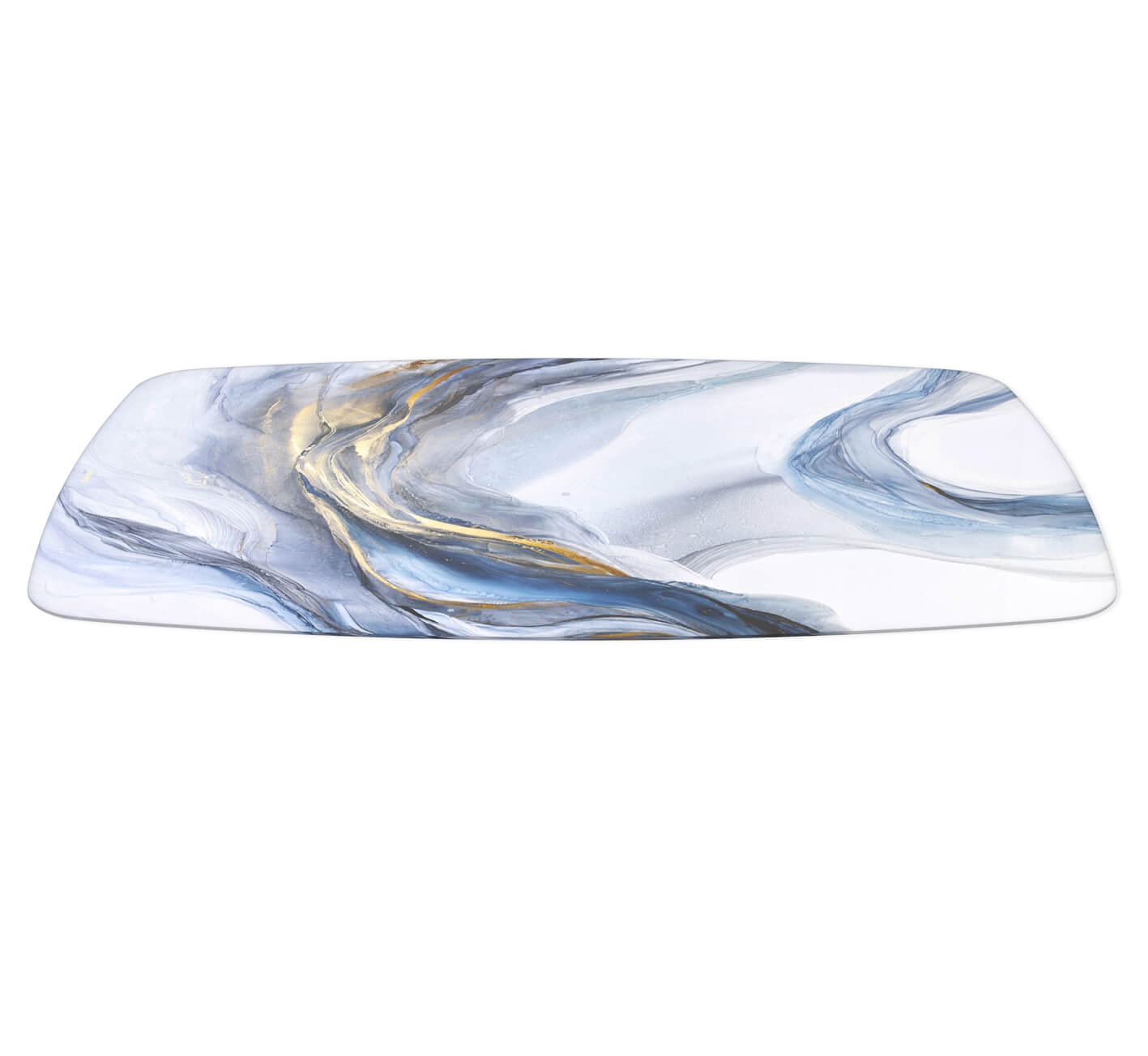 Столешница выполнена из закаленного стекла с ультрафиолетовой печатью. Одним из главных преимуществ закаленного стекла является его стойкость к высоким температурам, вибрационным нагрузкам, ударам и царапинам. Также стекло обладает высокой ударной вязкостью - энергия от столкновения с бьющим предметом распределяется относительно продолжительное время (по сравнению с обычным стеклом), что приводит к разрушению на очень мелкие осколки. Стекло закреплено на МДФ с отступом 50 мм.