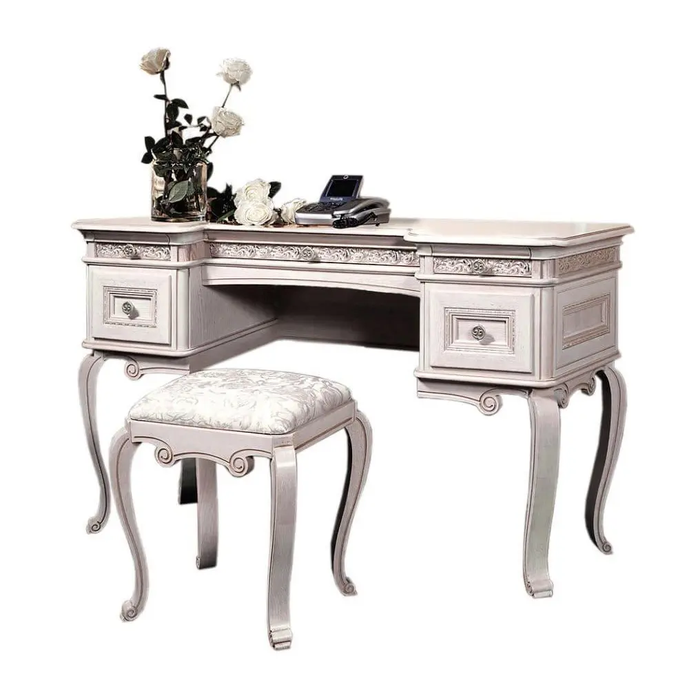 Банкетка богато декорирована резными конструктивными элементами и характерной для стиля художественной резьбой. Мебель в классическом стиле с роскошной декоративной резьбой на фасадах, стильными ручками и гнутыми фигурными ножками станет настоящим украшением вашего дома. Цвет отделки — «пепельный белый».