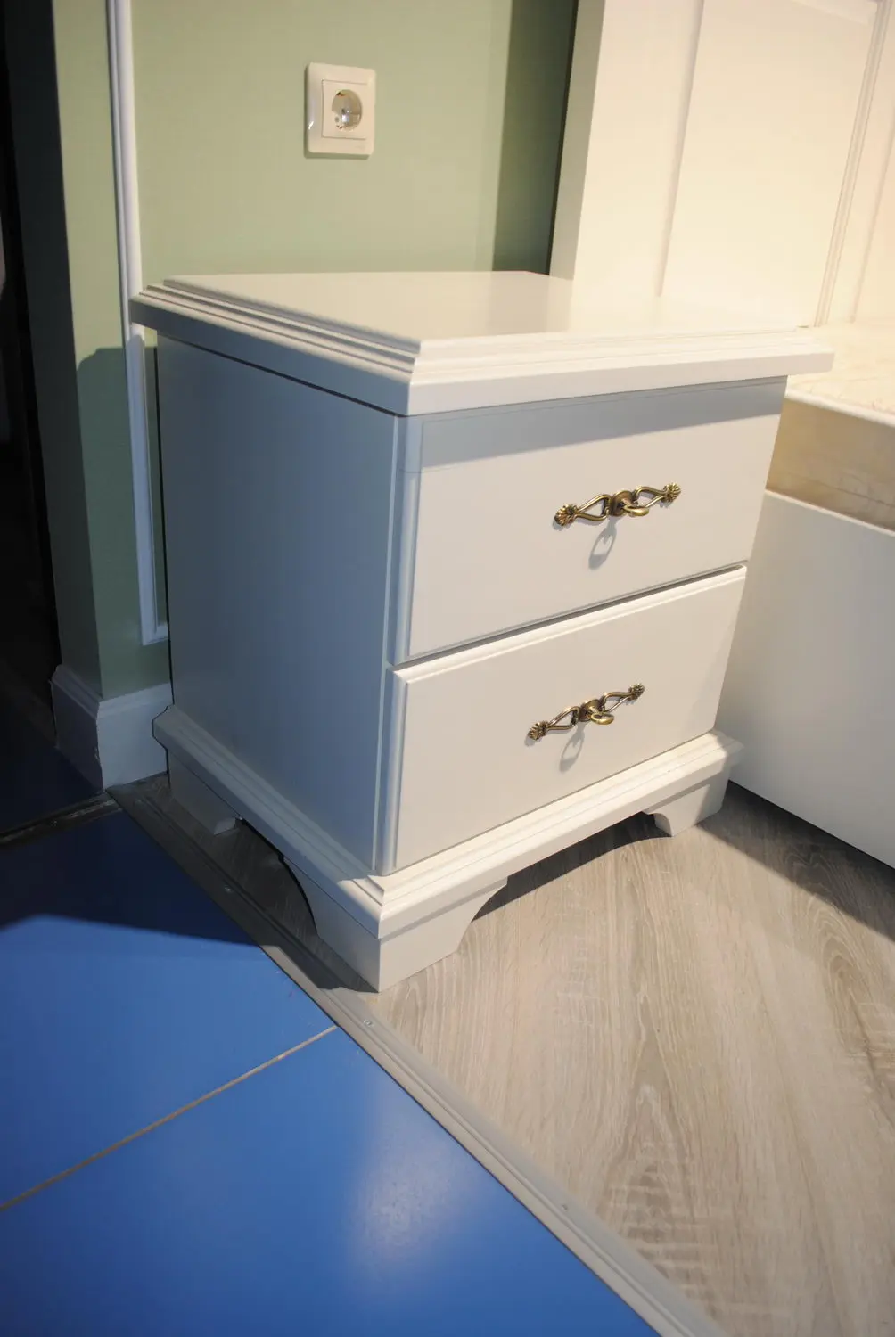 Внутренние боковины ящиков красятся в цвет лицевой панели. Задние стенки шкафа, а также дно ящиков, выполнены из белого двп.