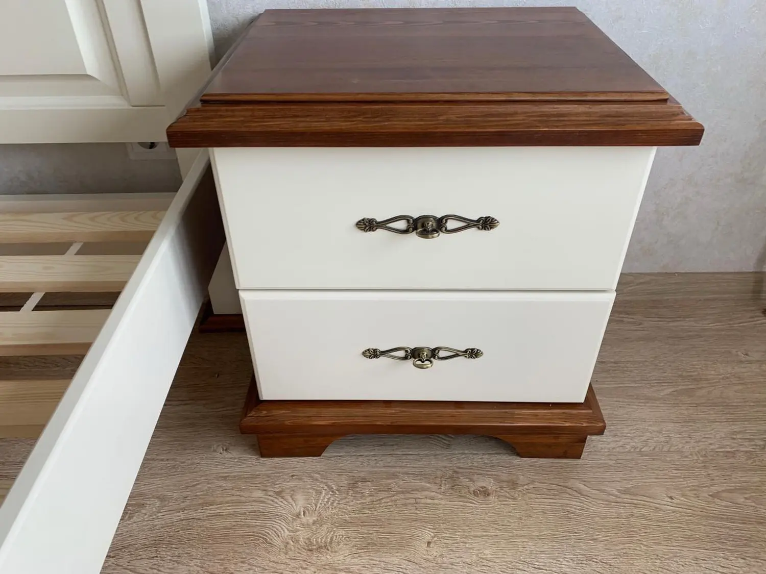 Прикроватная тумба Брусно, выполненная из массива сосны, содержит два выдвижных ящика на направляющих скрытого монтажа с доводчиками, обеспечивающих плавное выдвижение.
