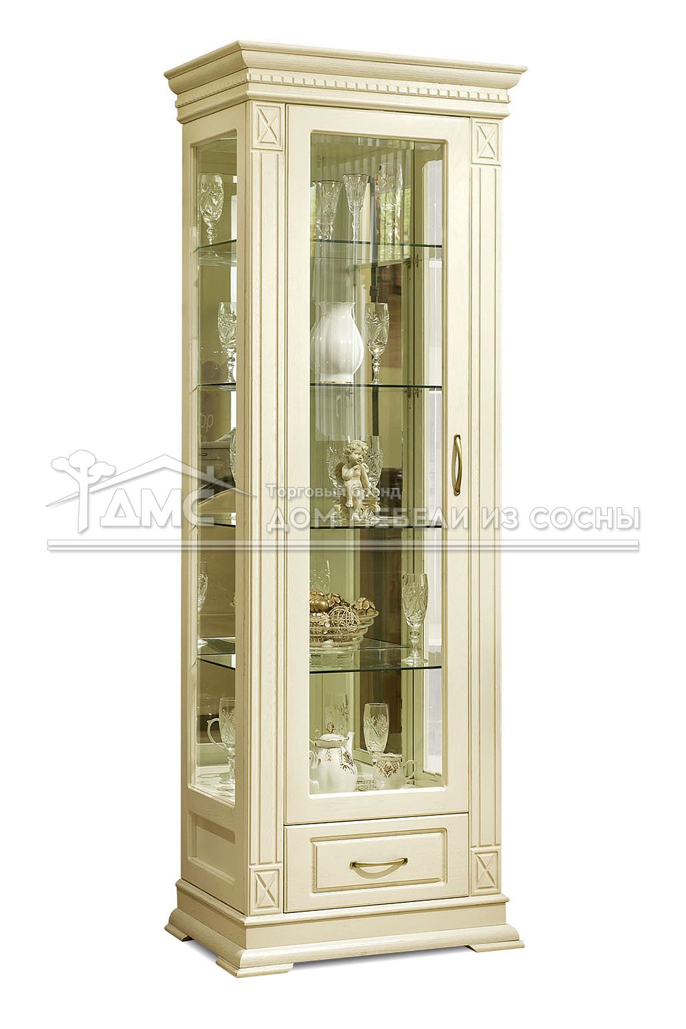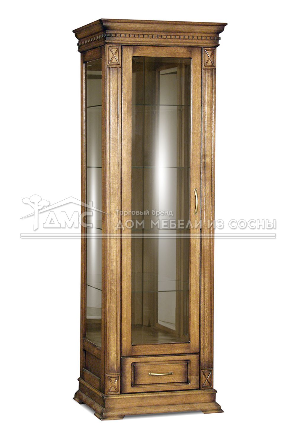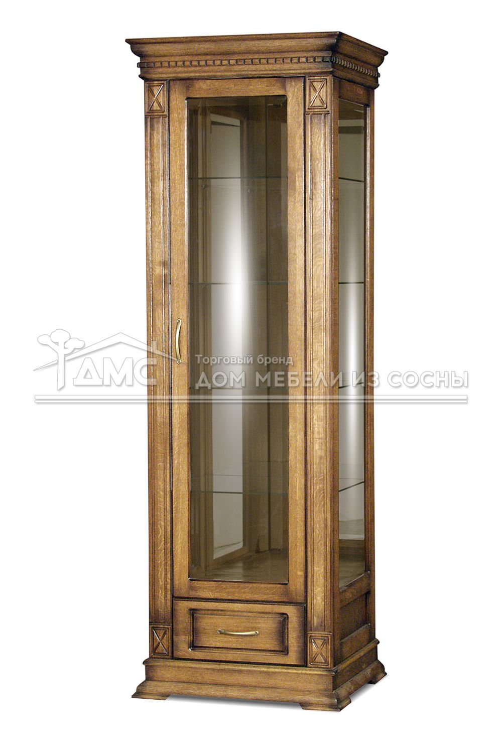 Устойчивость шкафу придаёт массивная нижняя панель и широкие ножки-подкладки. Фигурный карниз смотрится стильно и дорого, добавляя изысканности общему виду шкафа.