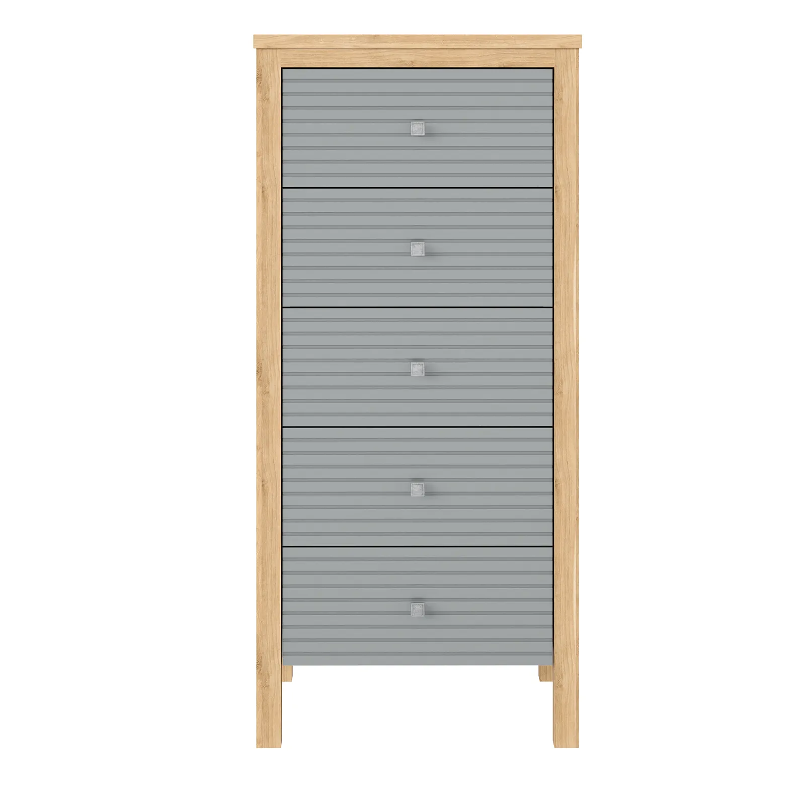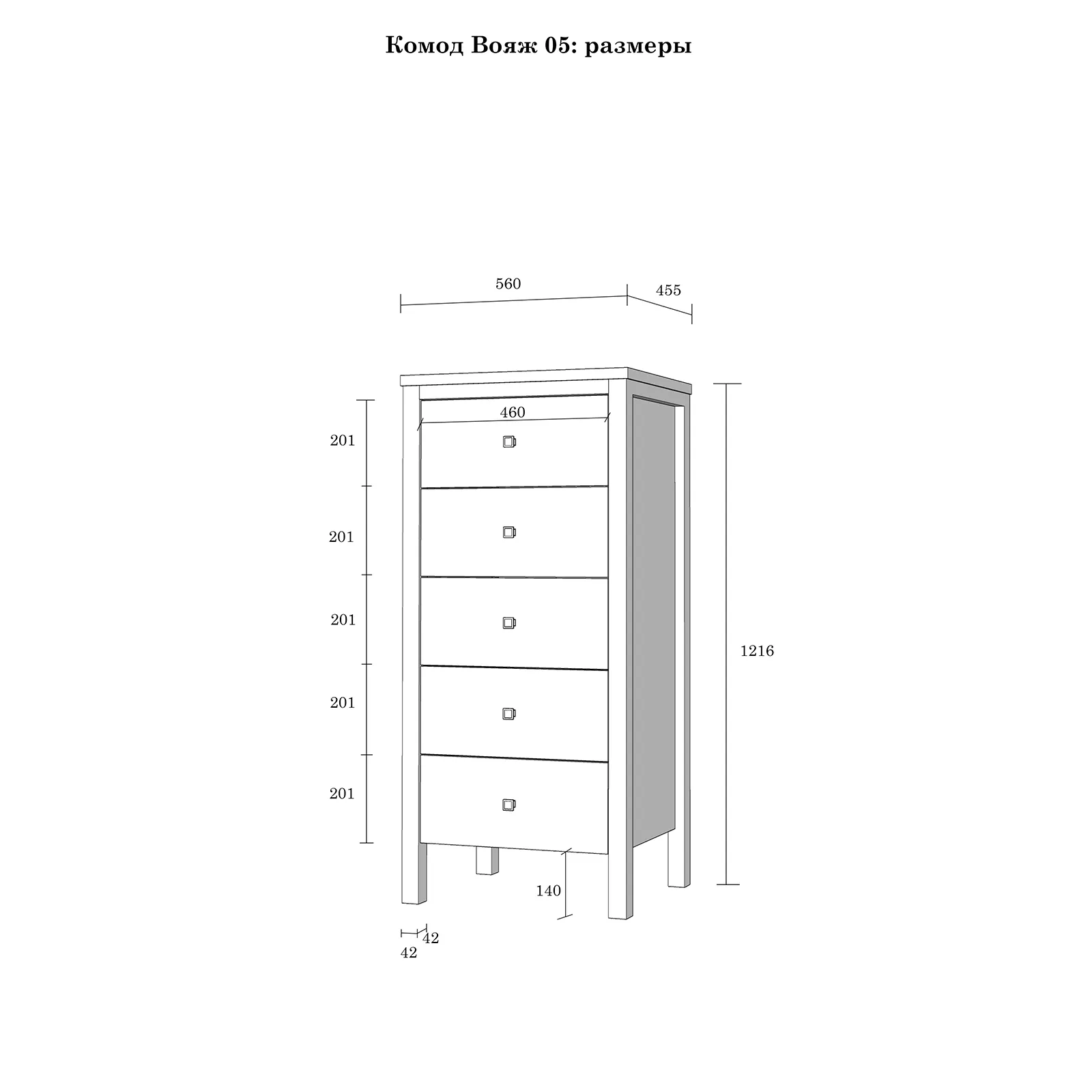 Комод оснащен пятью выдвижными ящиками с горизонтальными пропилами.