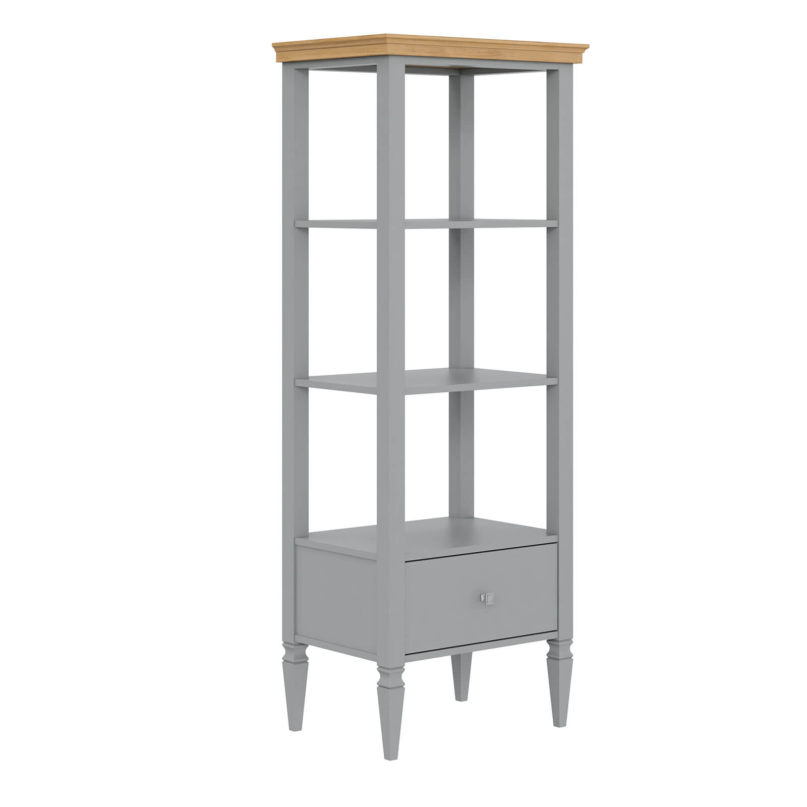 Этажерка оснащена двумя полками и одним выдвижным ящиком.