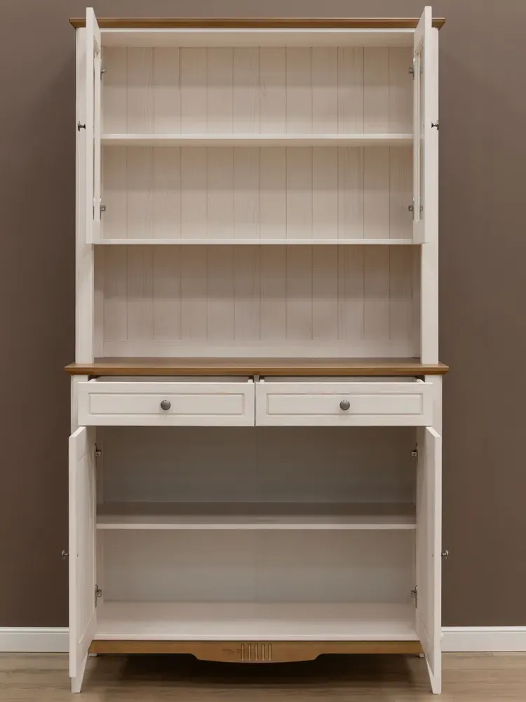 Буфет состоит из двух элементов: нижнего комода с двумя ящиками и двумя дверцами, а также верхней надстройки со стеклянными фасадами. Между ними образуется удобная открытая ниша — идеальное место для хранения или декоративной композиции.
