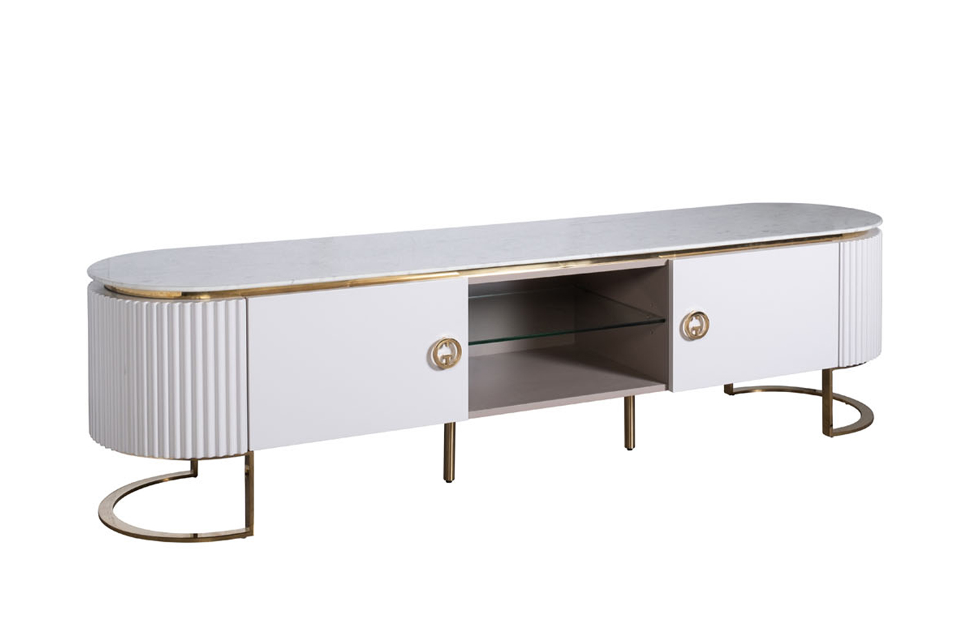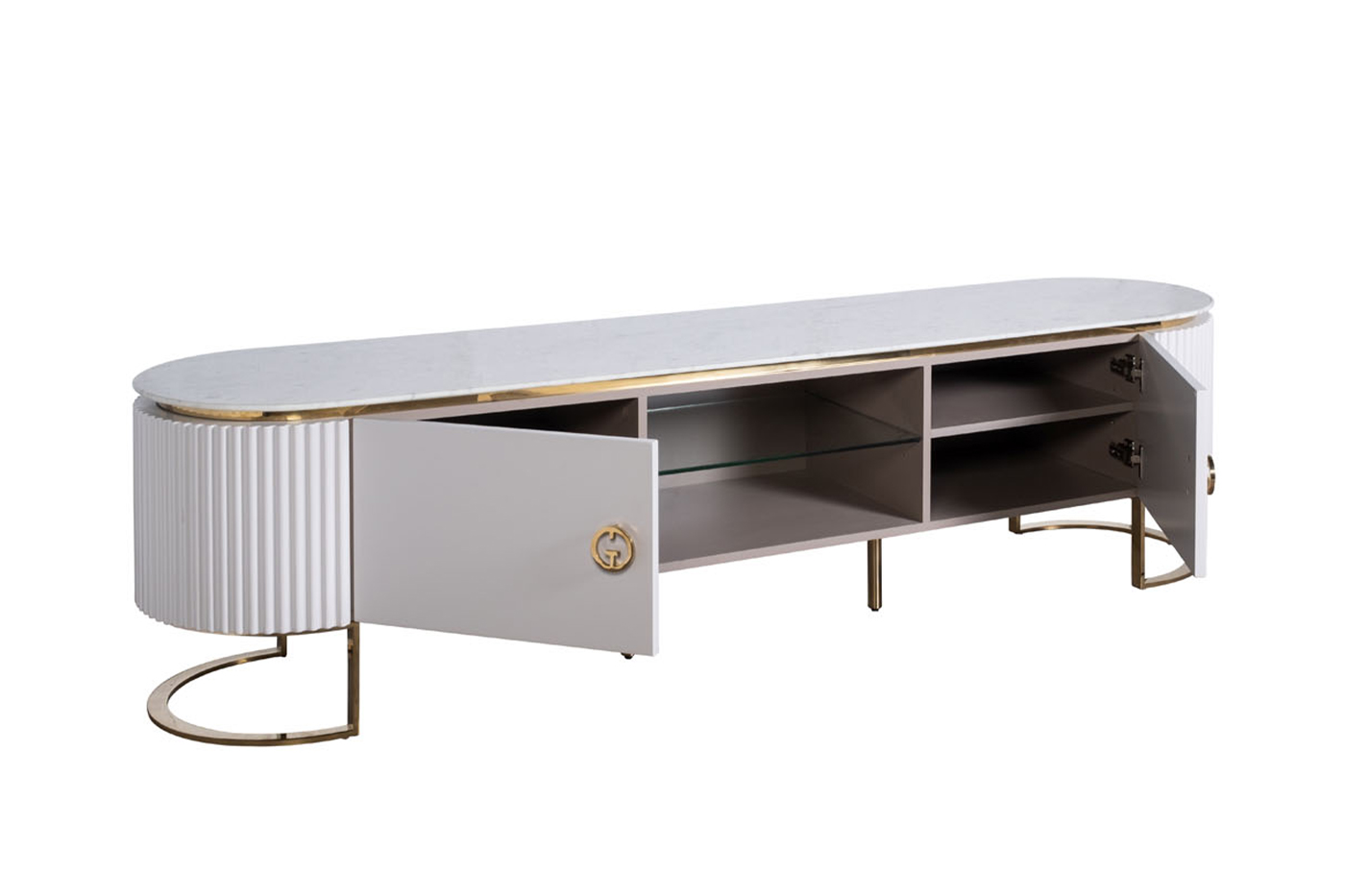 Тумба под телевизор с мрамором — это воплощение стиля и изысканности. CВЕТЛО-СЕРЫЙ цвет корпуса в сочетании с золотом выглядит очень благородно. Такой предмет мебели эффектно станет в центре гостиной, наполняя зону для отдыха приятной, умиротворяющей атмо...