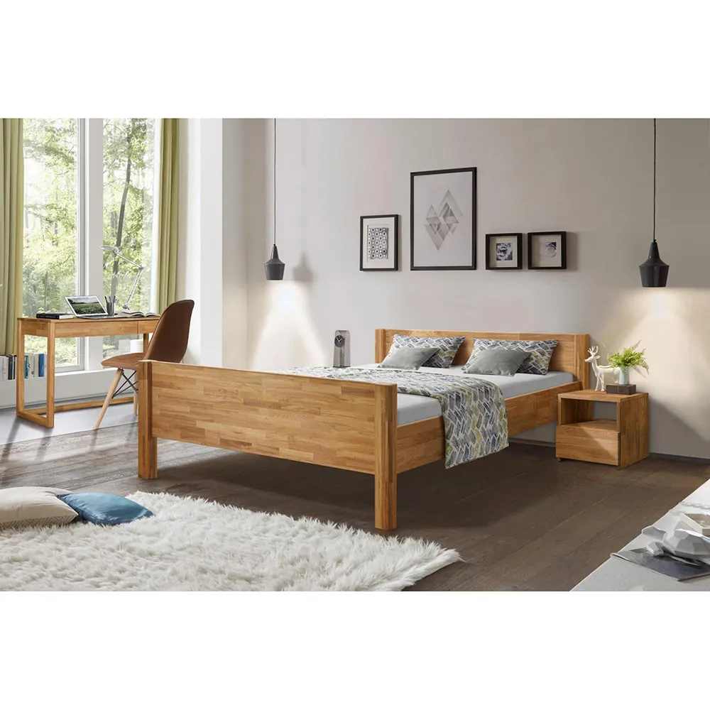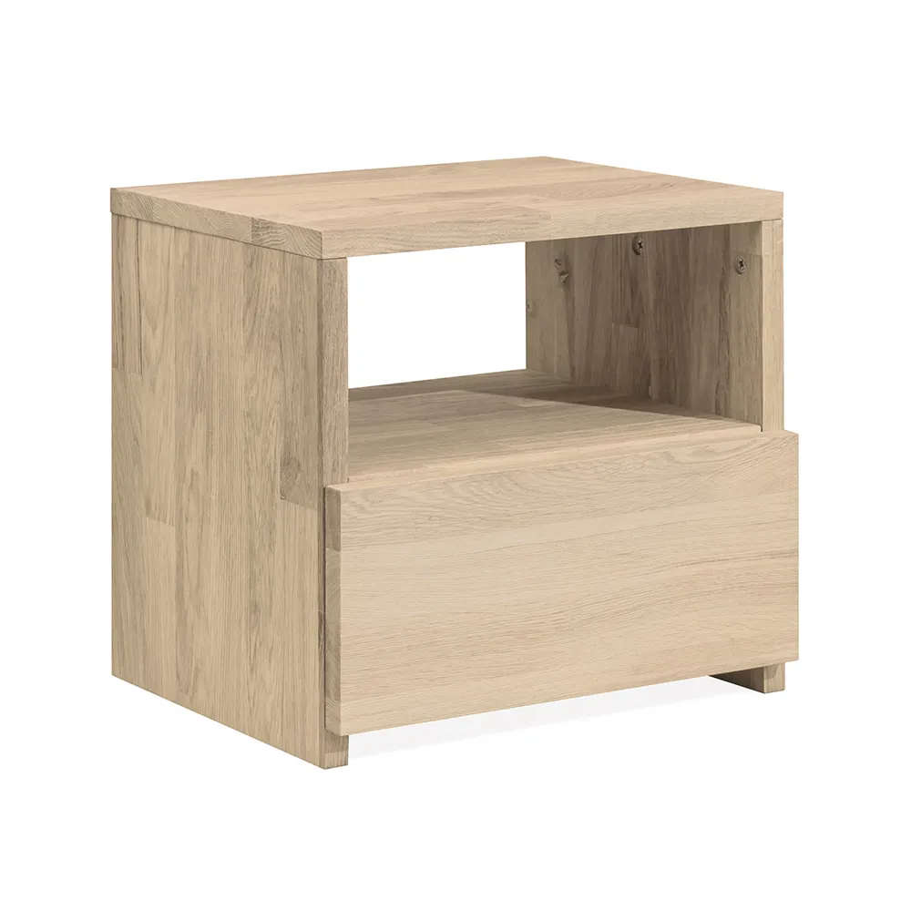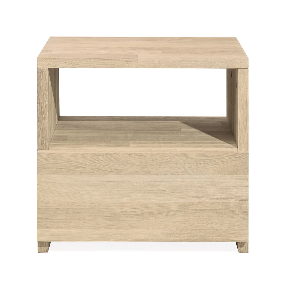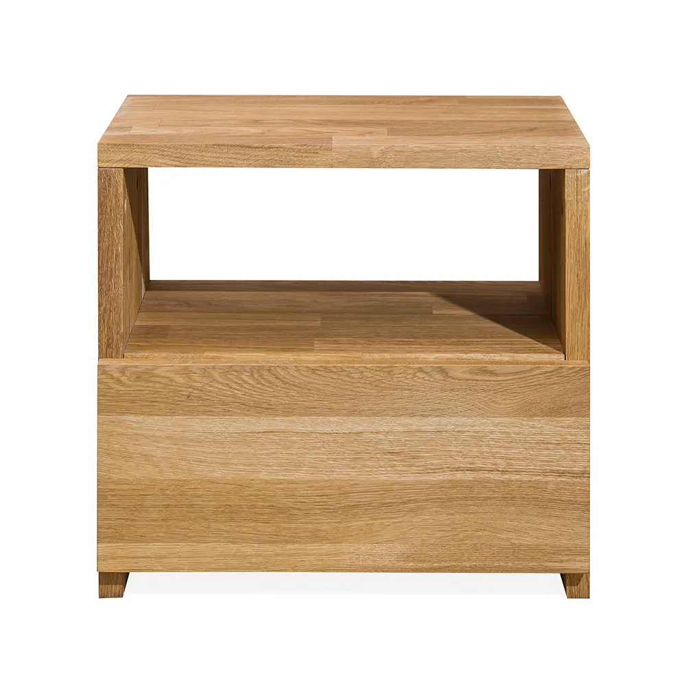 Прикроватная тумба «Ханс 1» изготовлена из из массива дуба – красивого и долговечного натурального материала. Задняя стенка и дно ящика сделаны из фанеры в шпоне дуба. На столешницу тумбы удобно класть перед сном телефон. В нишу и в ящик можно положить книги или разные мелочи. Предлагается 6 цветов отделки, на выбор: бейц-масло, отбеленный дуб, дуб венге, дуб паркетный, тёмная вишня, итальянский орех.