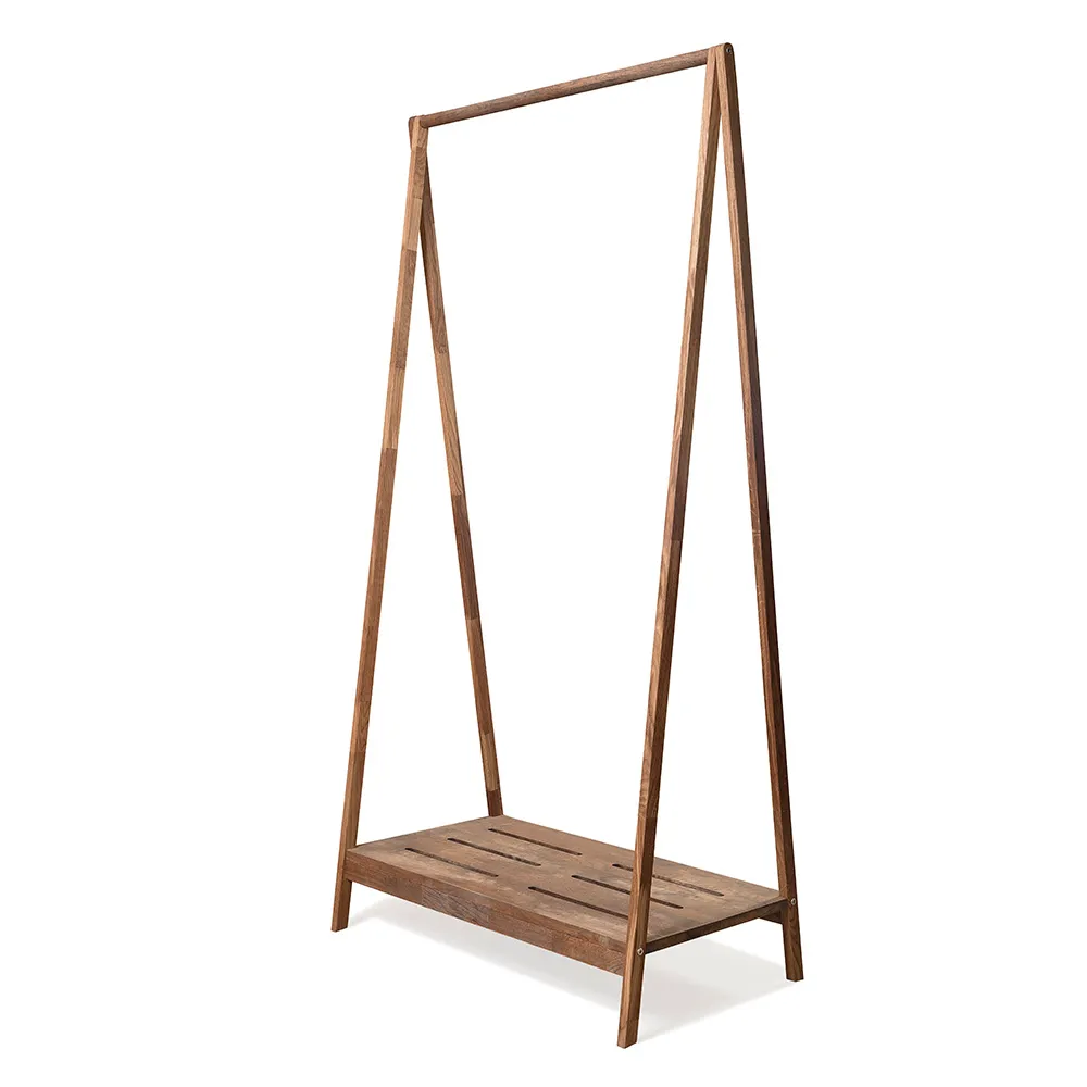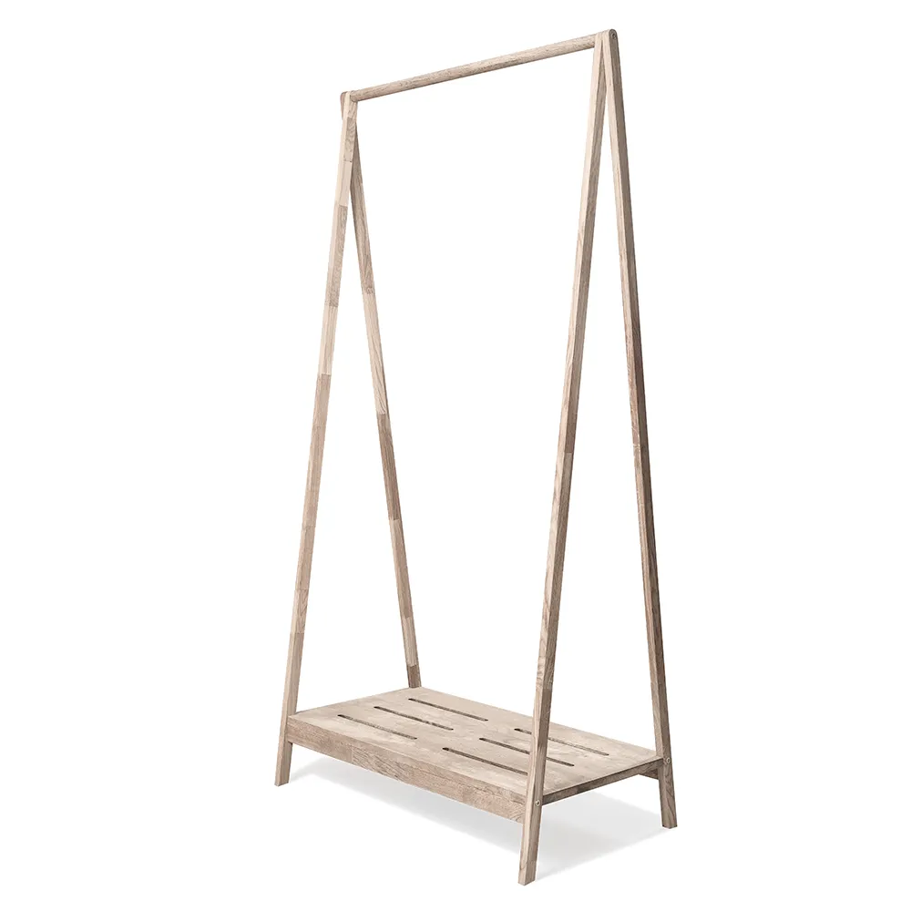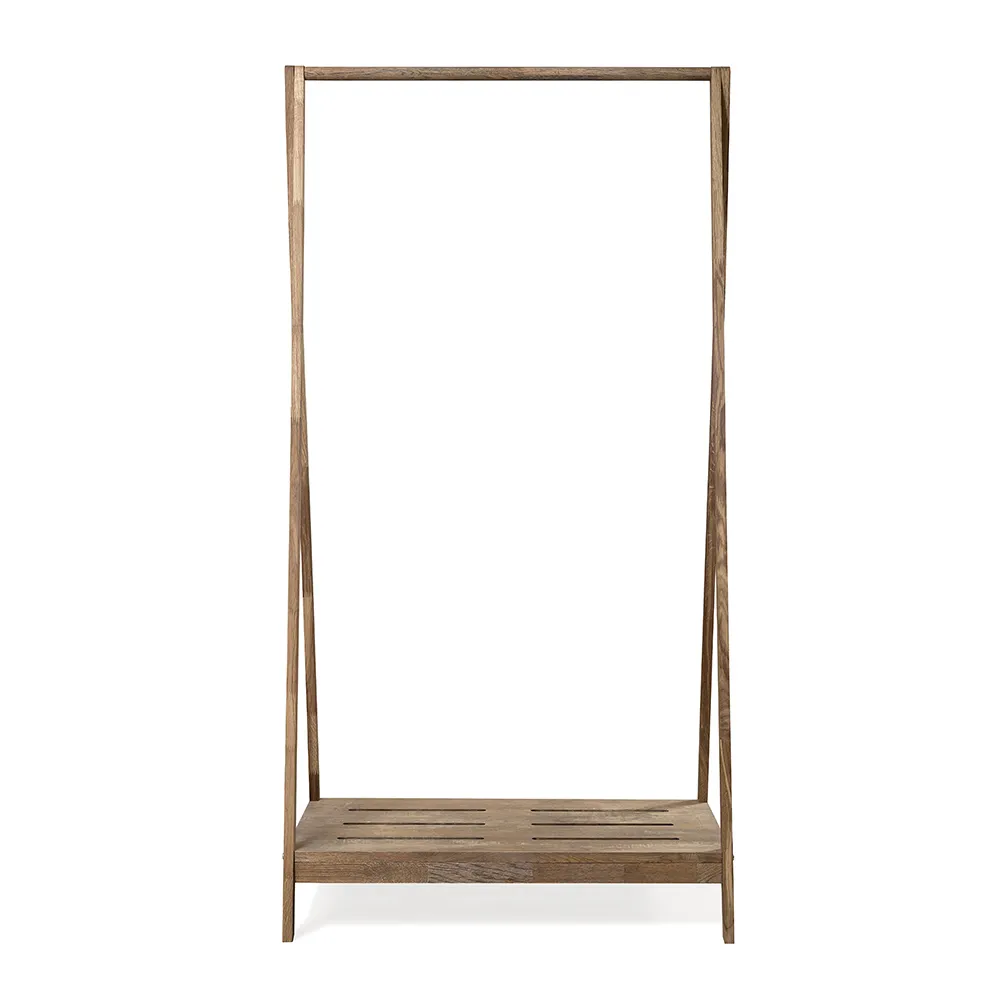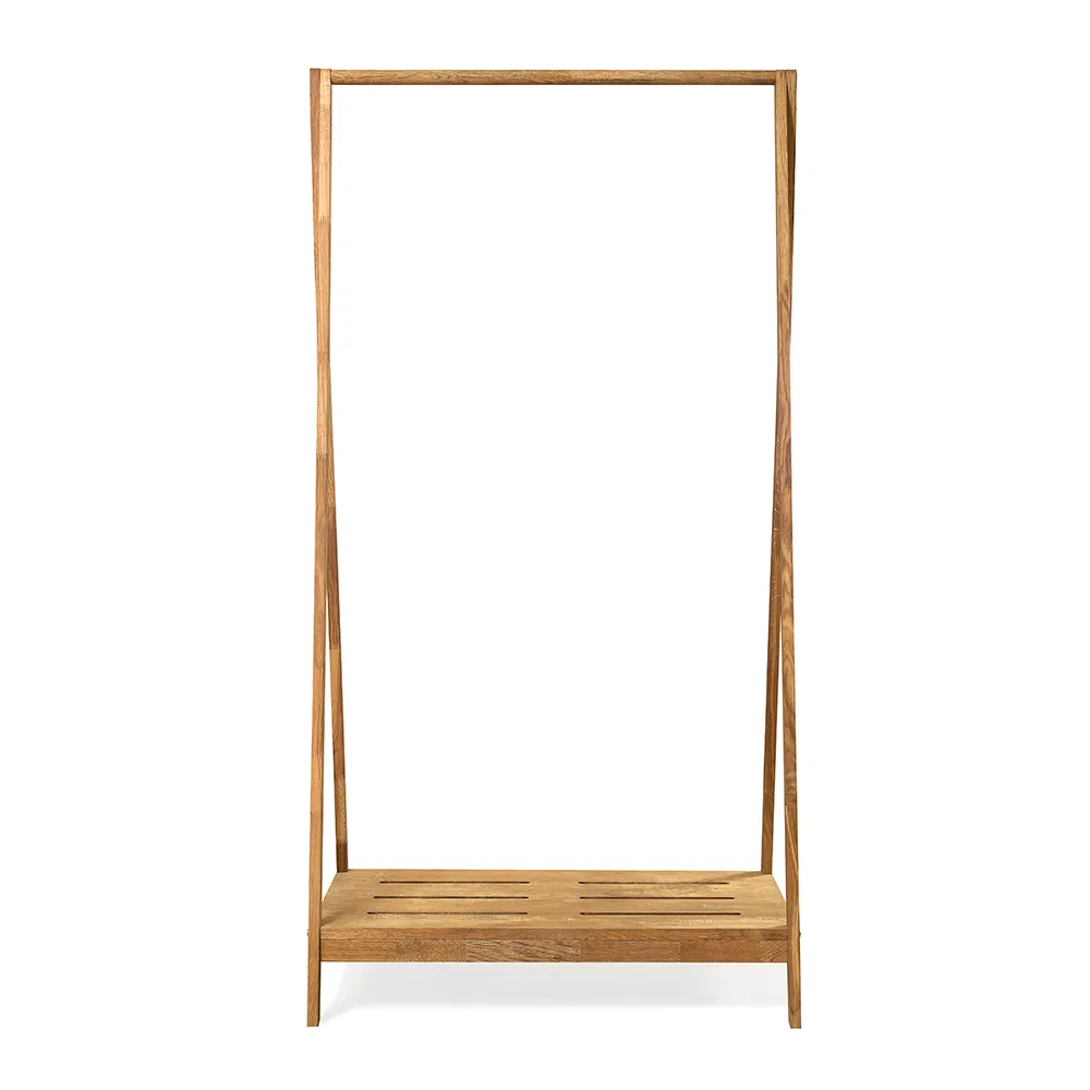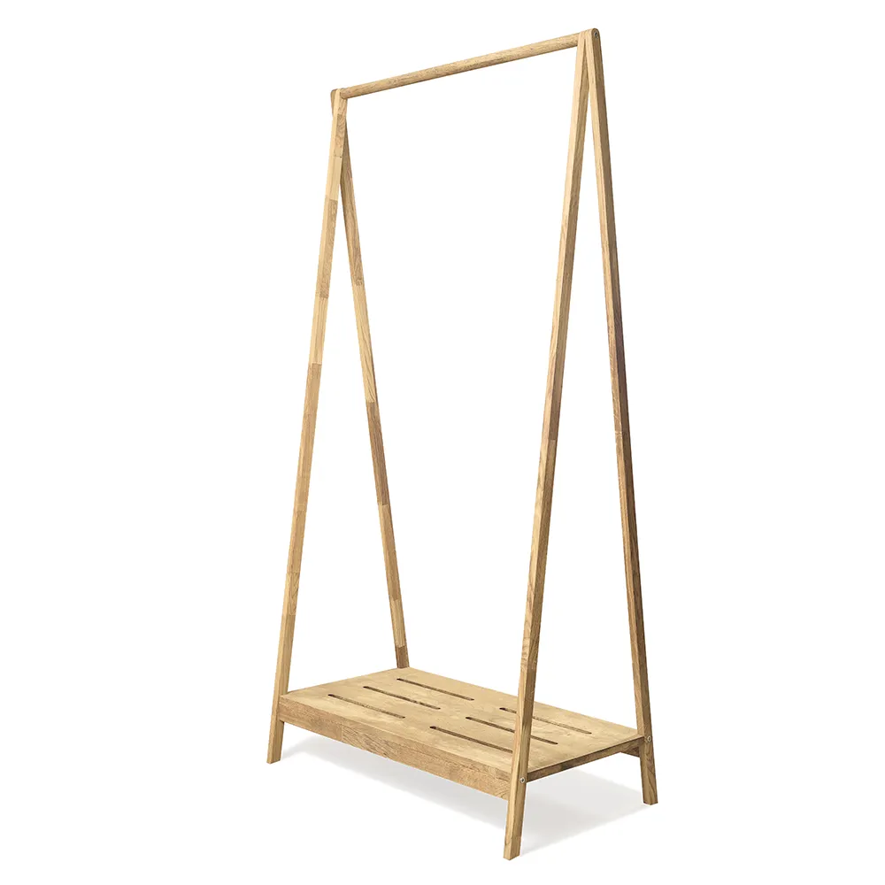 Стеллаж изготавливается из натурального долговечного материала – массива дуба. Дерево имеет красивую текстуру и приятно на ощупь. У стеллажа есть штанга для вешалок и широкая полка для обуви. Поставляется в собранном виде. Размеры стеллажа 900х480х1700 мм, вес 20 кг.