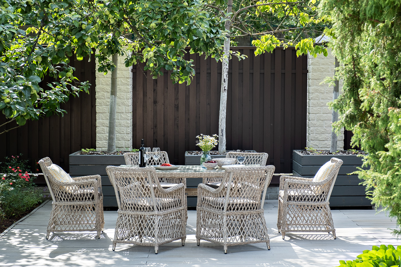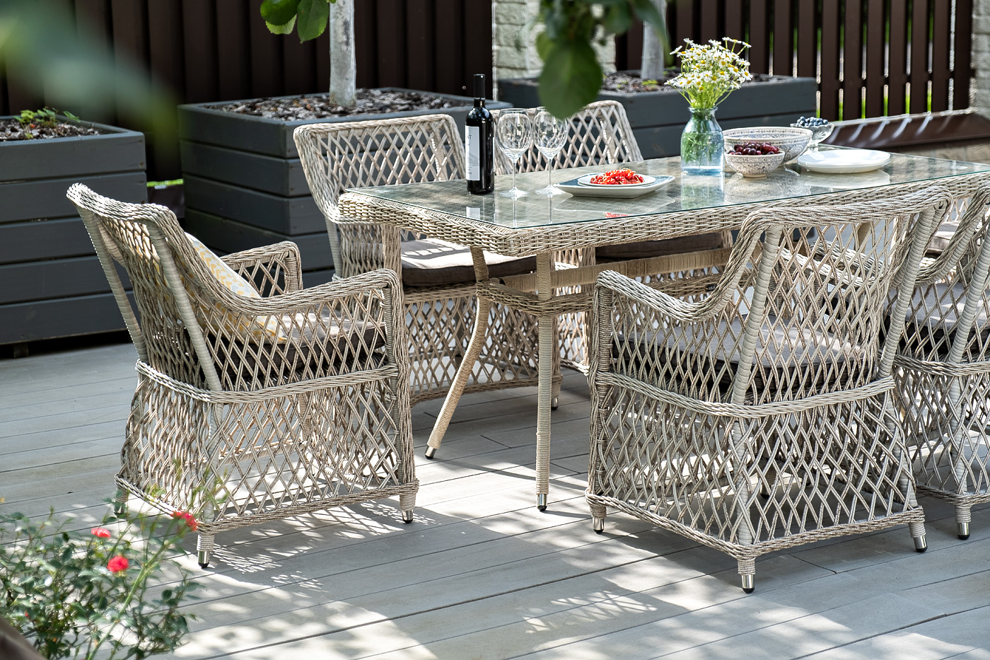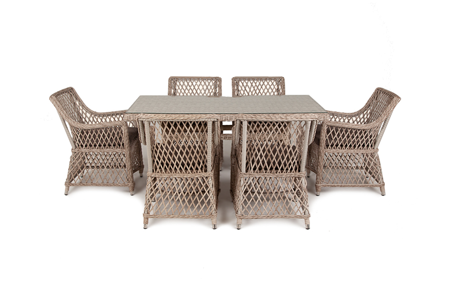 Ротанговая обеденная группа «Латтини» для создания зоны отдыха в саду, обустройства веранды отеля или ресторана. Набор состоит из прямоугольного стола со стеклянной столешницей, размером 1600х900х750 мм и 6 кресел, размером - 680х550х840 мм. Комплект гармонично сочетает в себе алюминий, из которого выполнен каркас и декор из искусственного ротанга бежевого оттенка. Прекрасным дополнением мебели стали мягкие подушки из всепогодной ткани со съемными чехлами. Вы можете приобрести каждый из элементов набора отдельно, чтобы оборудовать лаунж-зону нужного вам размера. "Латтини" плетеный стол из искусственного ротанга 160х90см, цвет бежевый 1шт. 1 600Х900Х750, "Латтини" плетеное кресло из искусственного ротанга, цвет бежевый 6шт. 550Х660Х850,