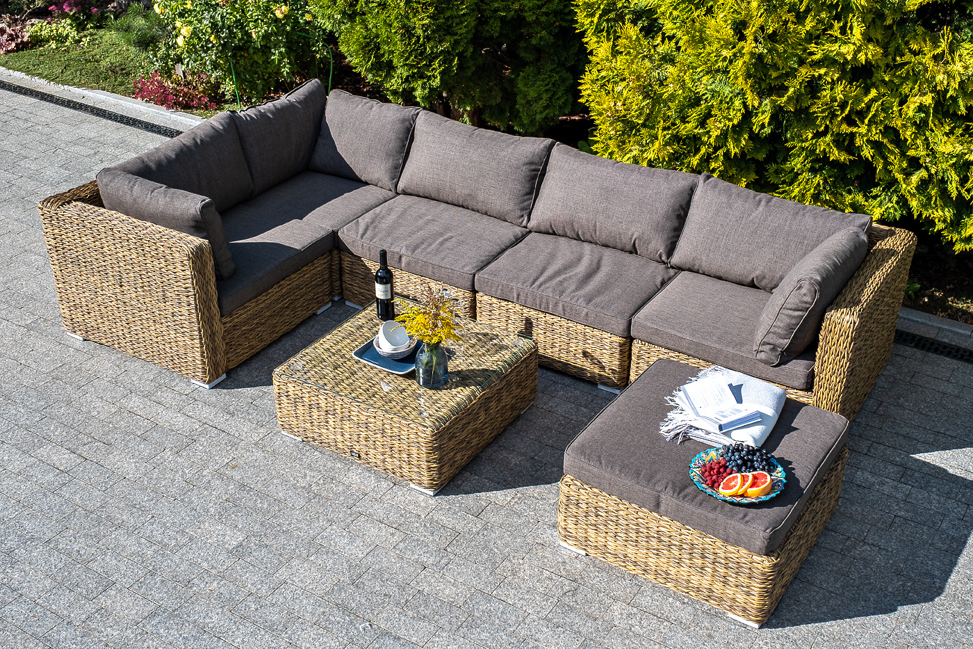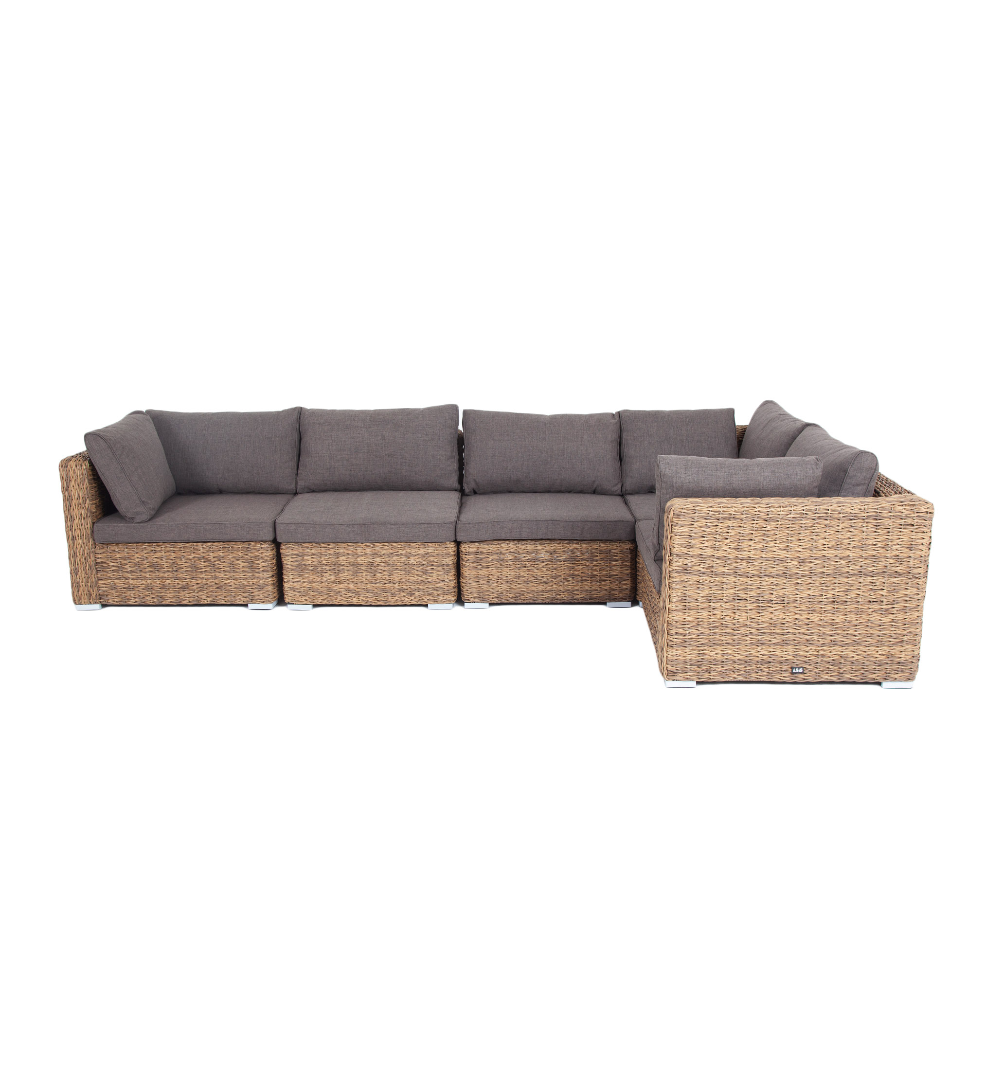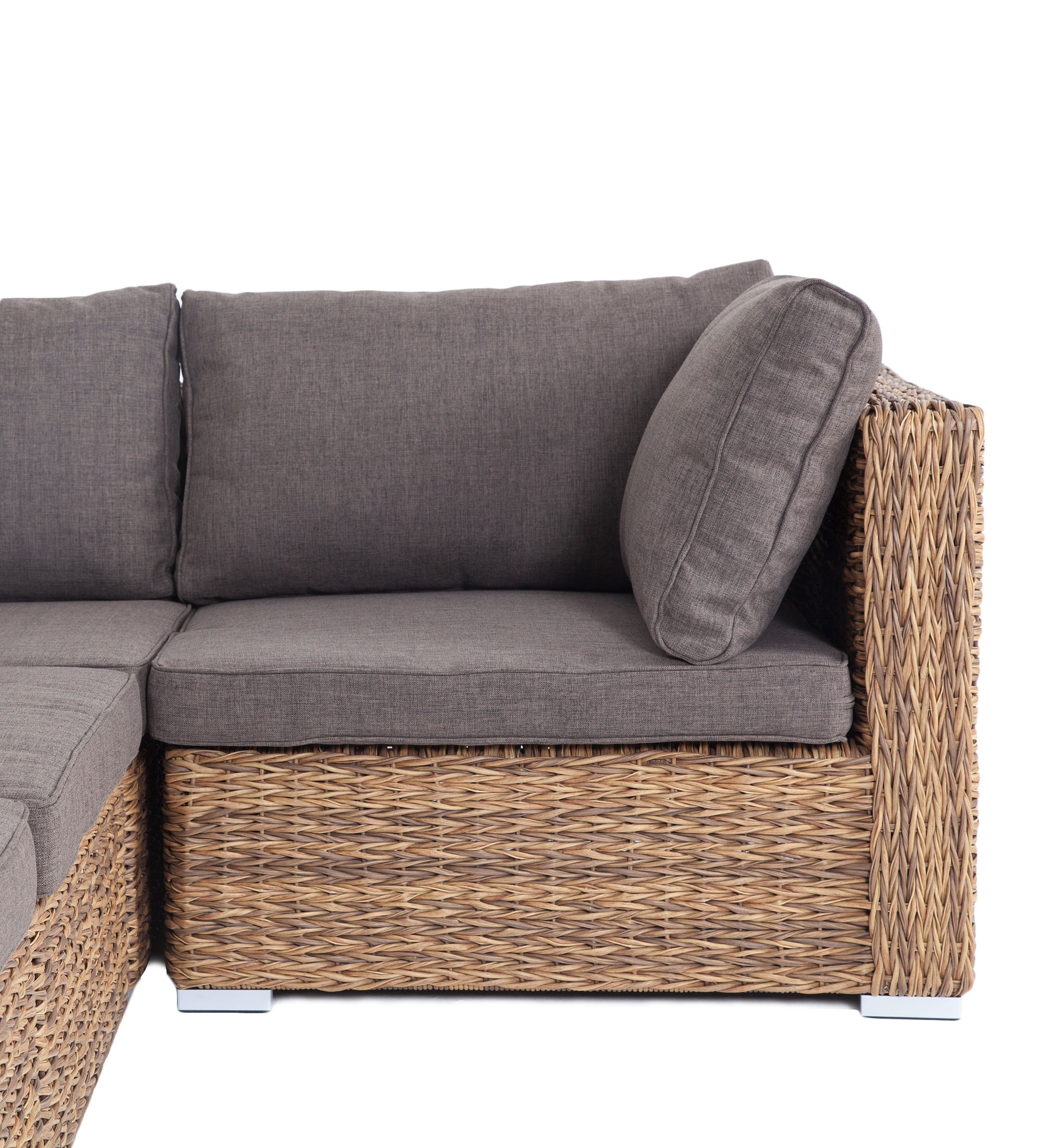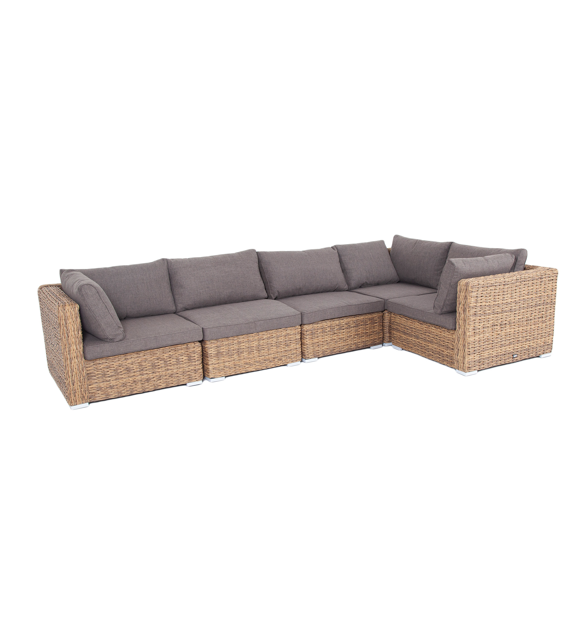Трансформирующийся диван "Лунджи" подходит для одновременного размещения до 8 персон. Его каркас выполнен из прочного алюминия. Мебедь состоит из трех угловых модулей размером – 860×860×650 мм и двух прямых модулей размером – 740×860×650 мм. Комплект выполнен из искусственного ротанга вида "гиацинт" ручного плетения. Представлен в соломенном цвете. Модульный диван дополняют подушки со съемными чехлами в серо-коричневом оттенке. При их пошиве используется полиэстер, плотностью 230гр/м2. Ткань обрабатывается влагоотталкивающей пропиткой для усиления ее защитных качеств. "Лунджи" модуль диванный угловой с подушками, цвет соломенный (гиацинт) 3шт. 860Х860Х650, "Лунджи" модуль диванный прямой с подушками, цвет соломенный (гиацинт) 2шт. 740Х860Х650,