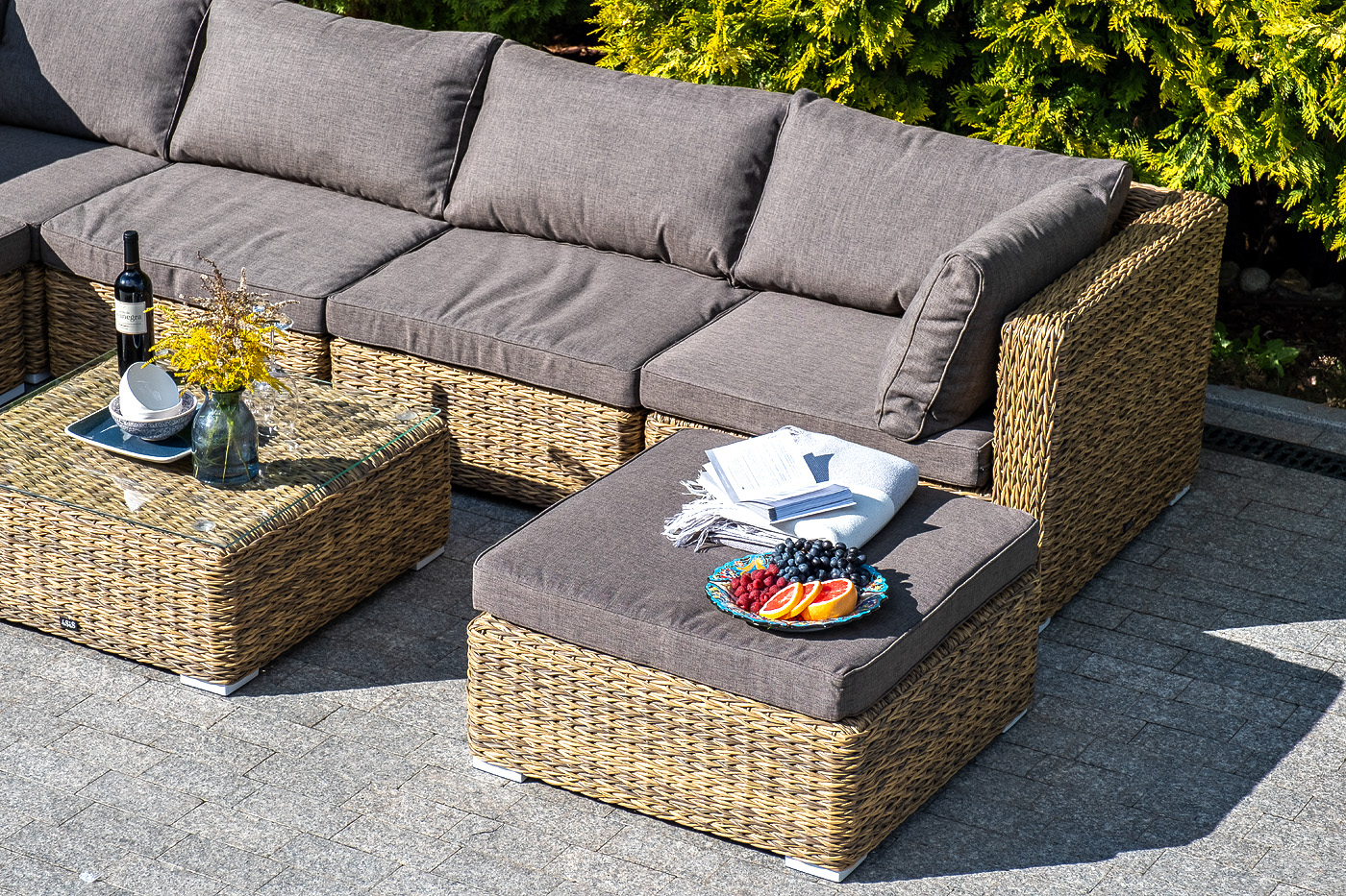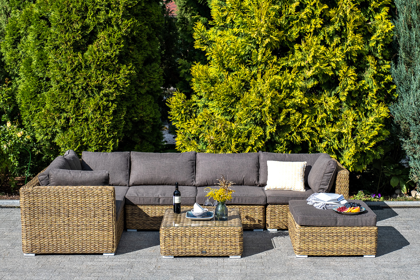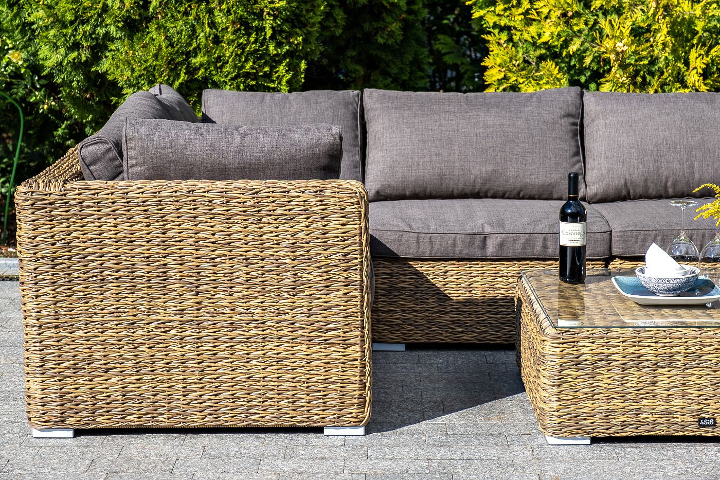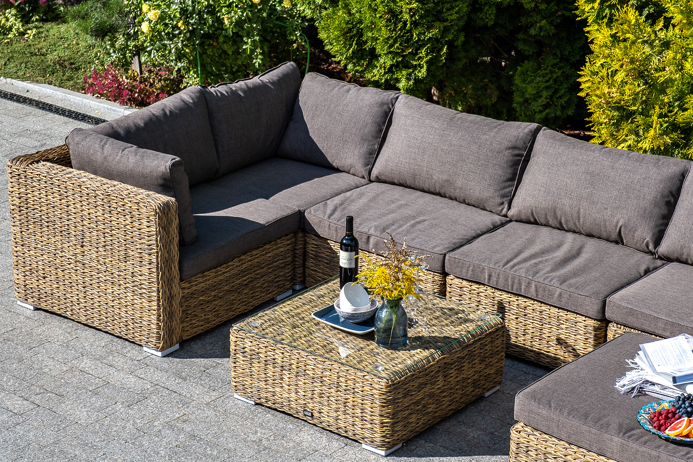 Трансформирующийся диван "Лунджи" подходит для одновременного размещения до 8 персон. Его каркас выполнен из прочного алюминия. Мебедь состоит из трех угловых модулей размером – 860×860×650 мм и двух прямых модулей размером – 740×860×650 мм. Комплект выполнен из искусственного ротанга вида "гиацинт" ручного плетения. Представлен в соломенном цвете. Модульный диван дополняют подушки со съемными чехлами в серо-коричневом оттенке. При их пошиве используется полиэстер, плотностью 230гр/м2. Ткань обрабатывается влагоотталкивающей пропиткой для усиления ее защитных качеств. "Лунджи" модуль диванный угловой с подушками, цвет соломенный (гиацинт) 3шт. 860Х860Х650, "Лунджи" модуль диванный прямой с подушками, цвет соломенный (гиацинт) 2шт. 740Х860Х650,