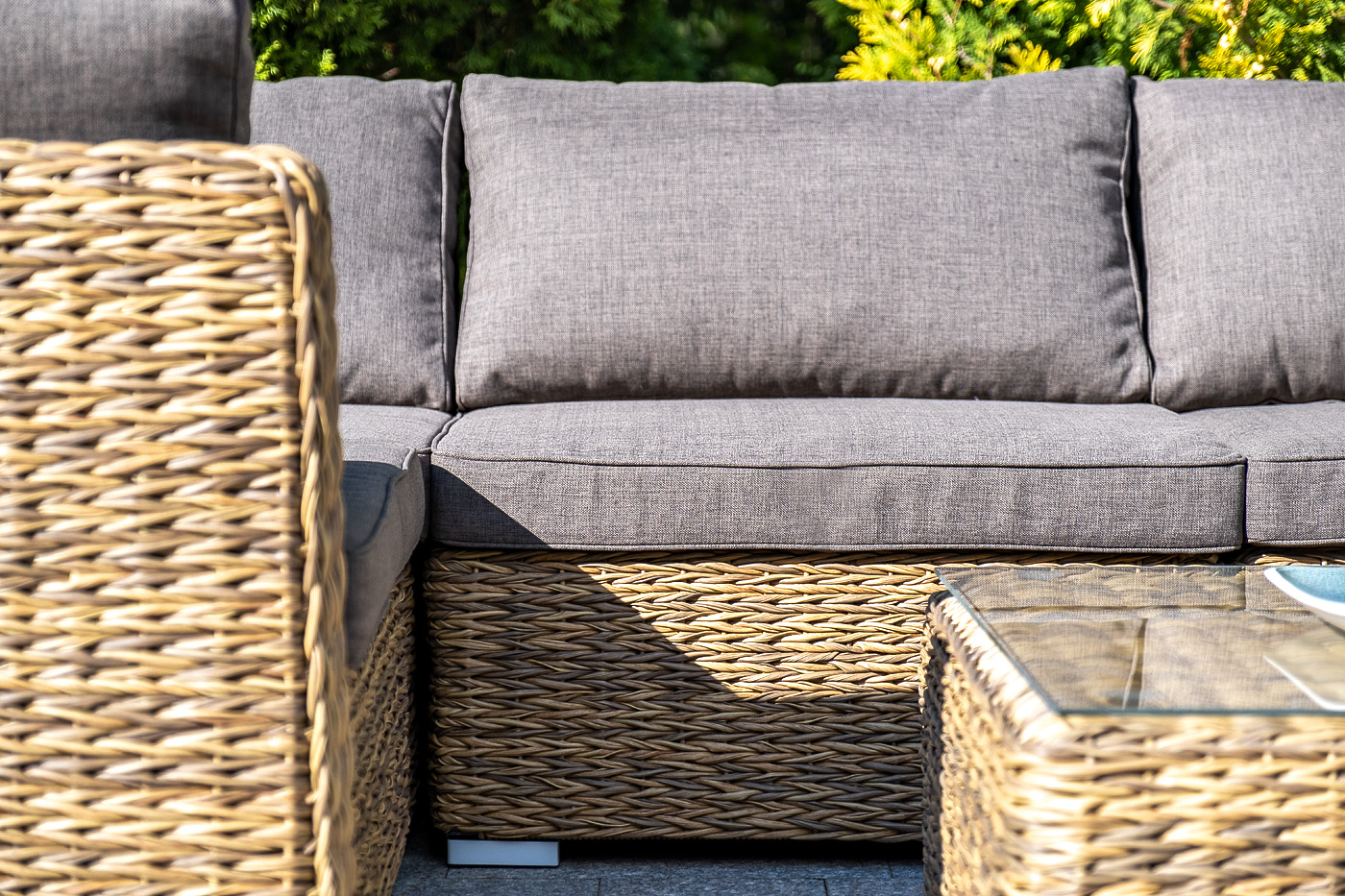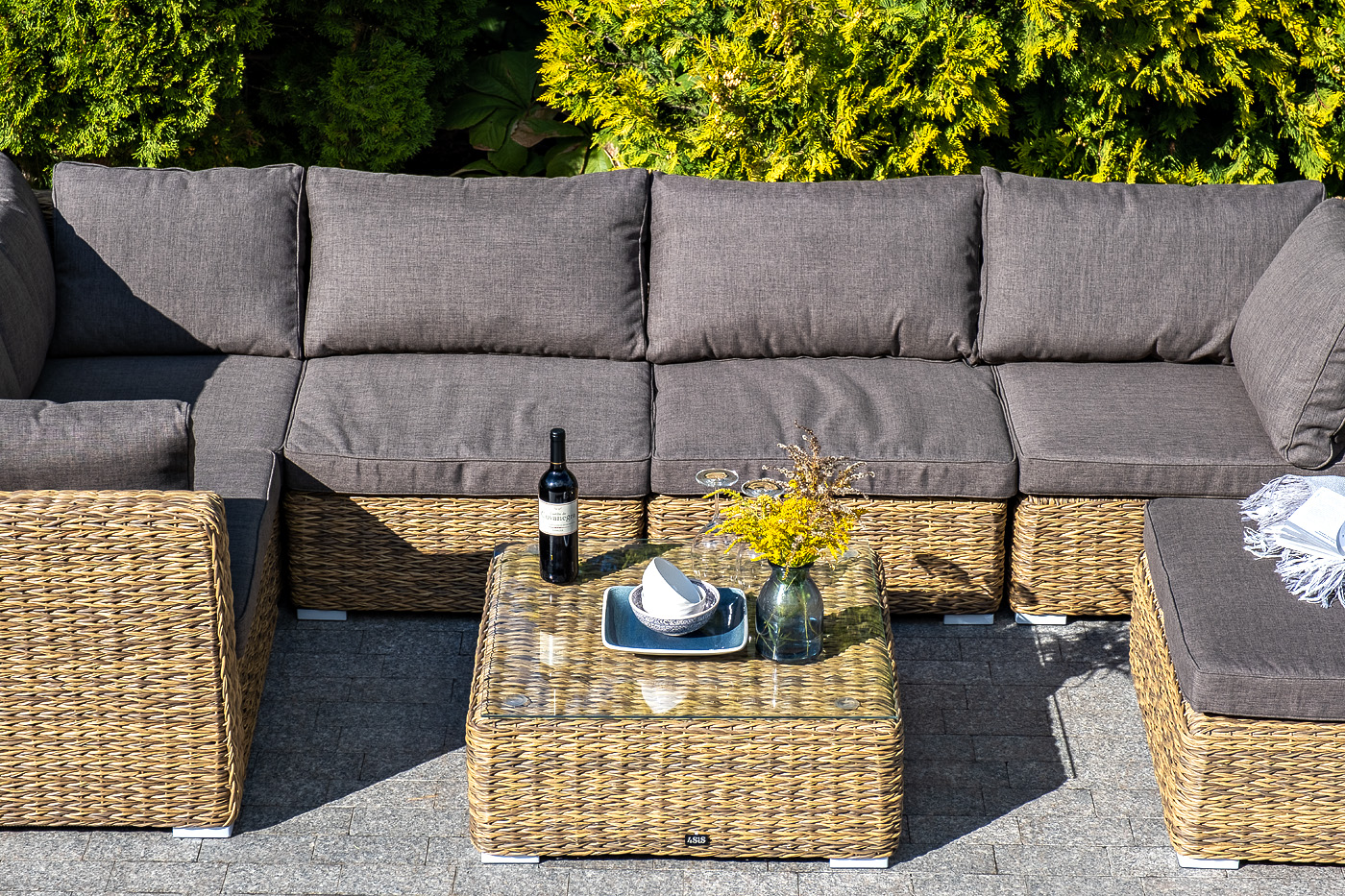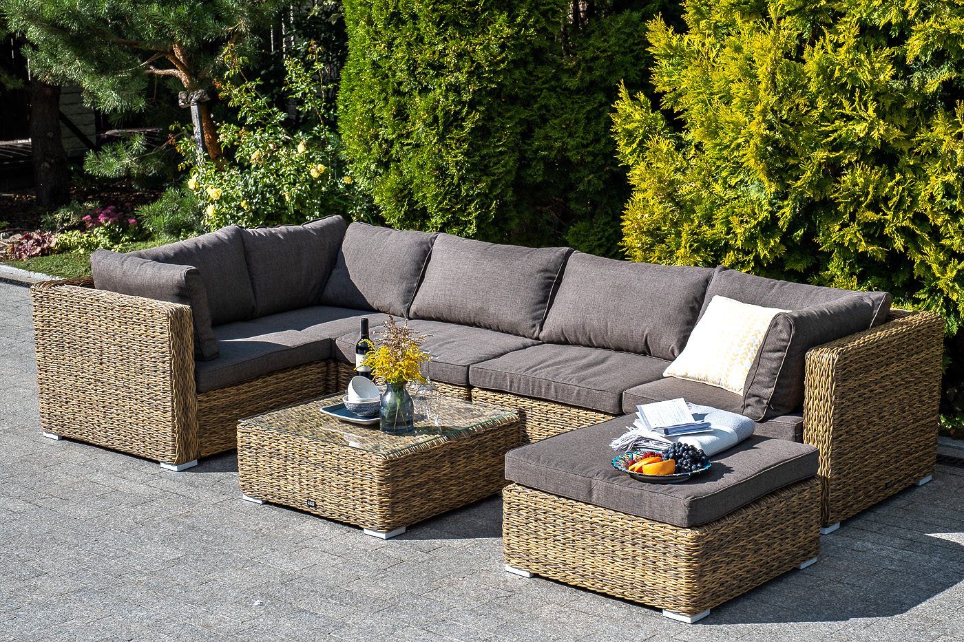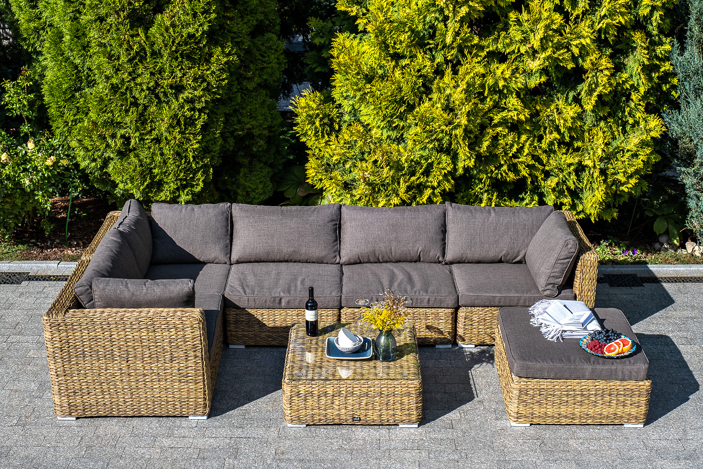 Трансформирующийся диван "Лунджи" подходит для одновременного размещения до 8 персон. Его каркас выполнен из прочного алюминия. Мебедь состоит из трех угловых модулей размером – 860×860×650 мм и двух прямых модулей размером – 740×860×650 мм. Комплект выполнен из искусственного ротанга вида "гиацинт" ручного плетения. Представлен в соломенном цвете. Модульный диван дополняют подушки со съемными чехлами в серо-коричневом оттенке. При их пошиве используется полиэстер, плотностью 230гр/м2. Ткань обрабатывается влагоотталкивающей пропиткой для усиления ее защитных качеств. "Лунджи" модуль диванный угловой с подушками, цвет соломенный (гиацинт) 3шт. 860Х860Х650, "Лунджи" модуль диванный прямой с подушками, цвет соломенный (гиацинт) 2шт. 740Х860Х650,