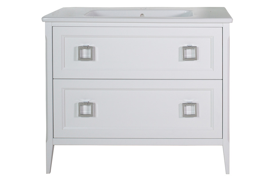 Оригинальный дизайн подстолья с ящиками позволяет ему гармонично вписаться в любой интерьер. Белая мебель для ванной создаёт ощущение чистоты и свежести, а также визуально расширяет пространство.