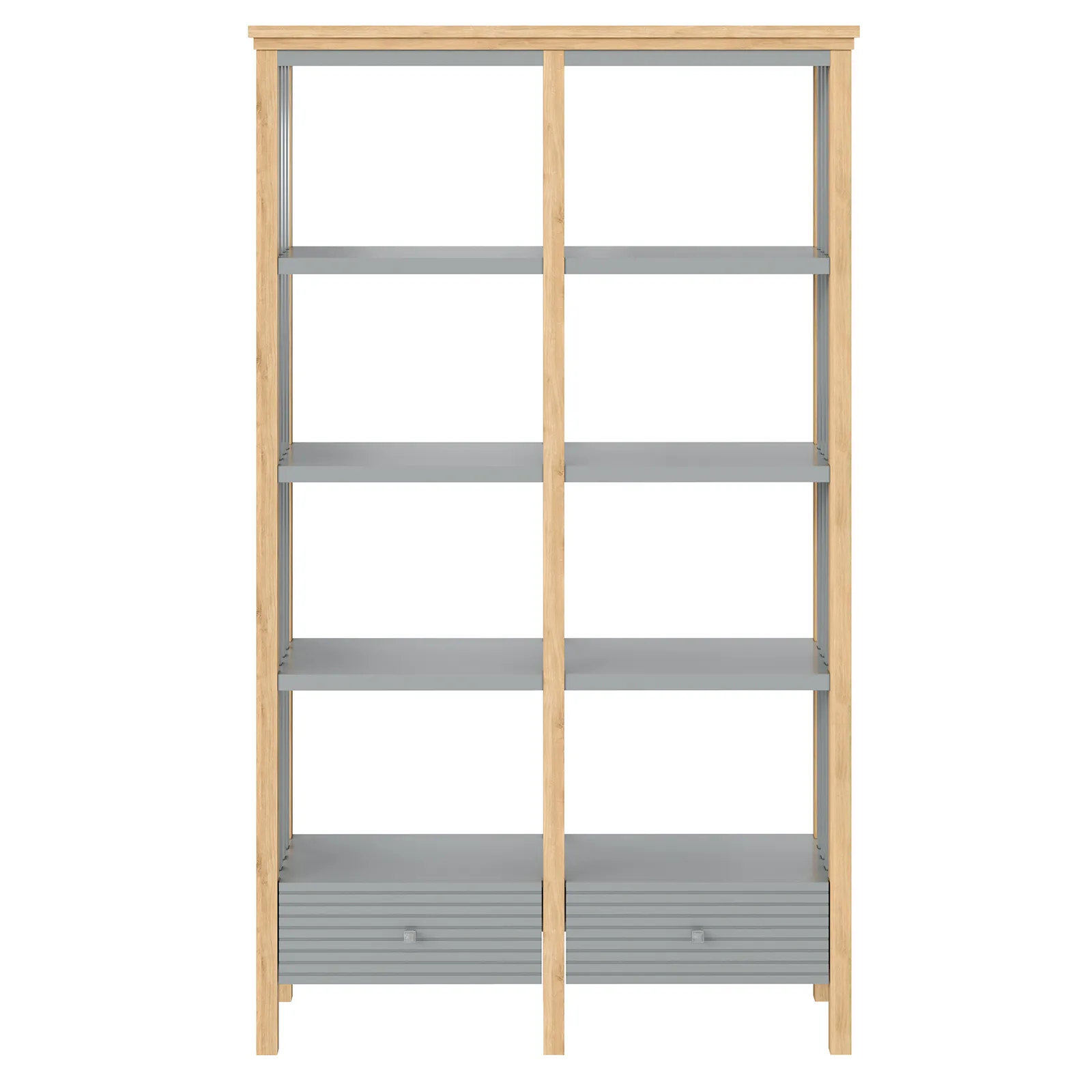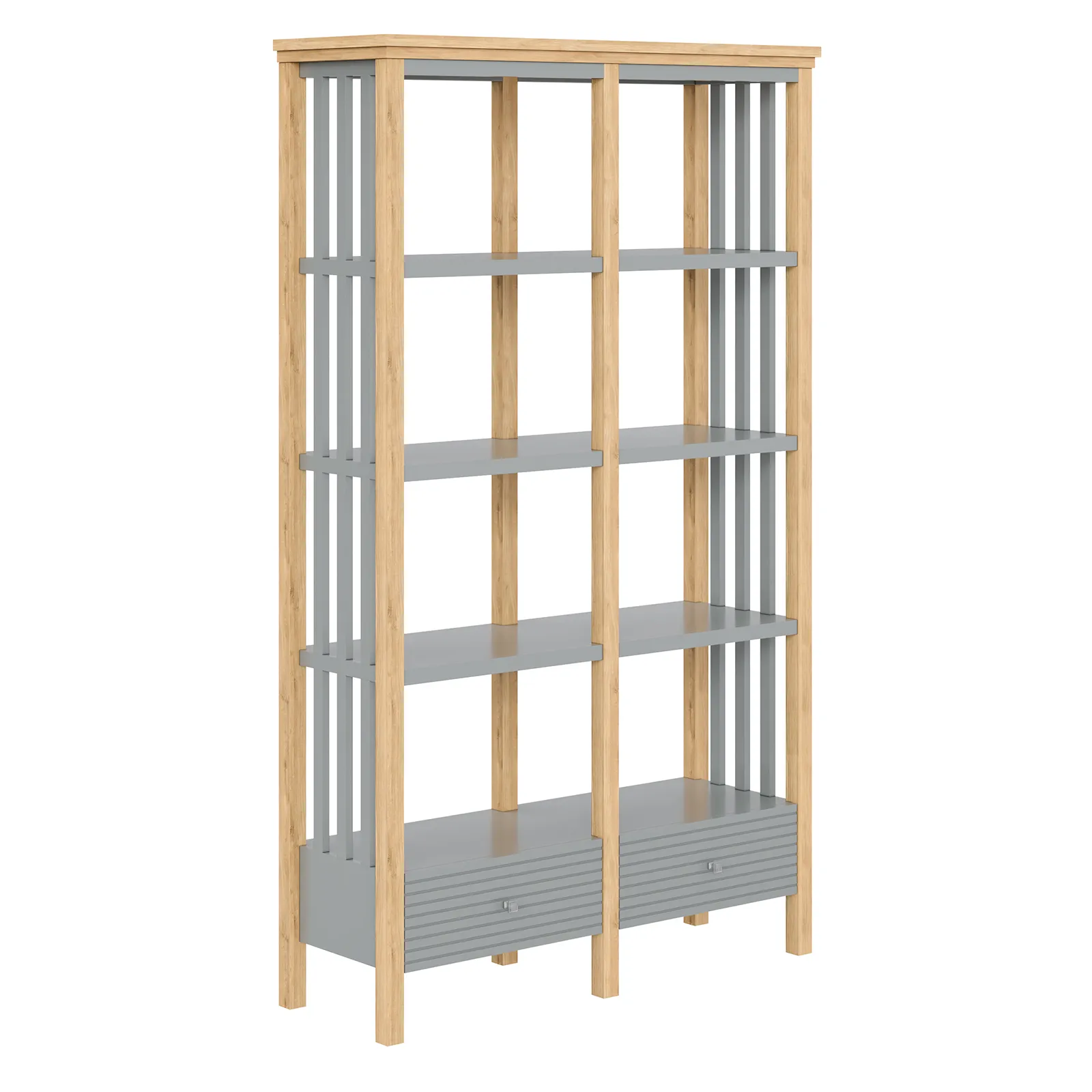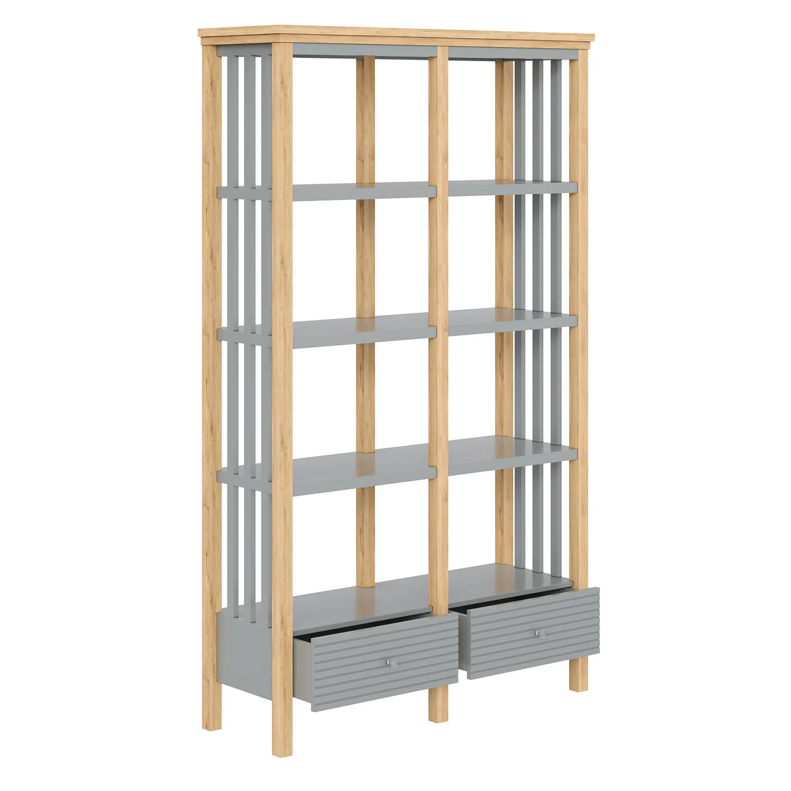 Стеллаж оснащен одной длинной полкой и двумя выдвижными ящиками.