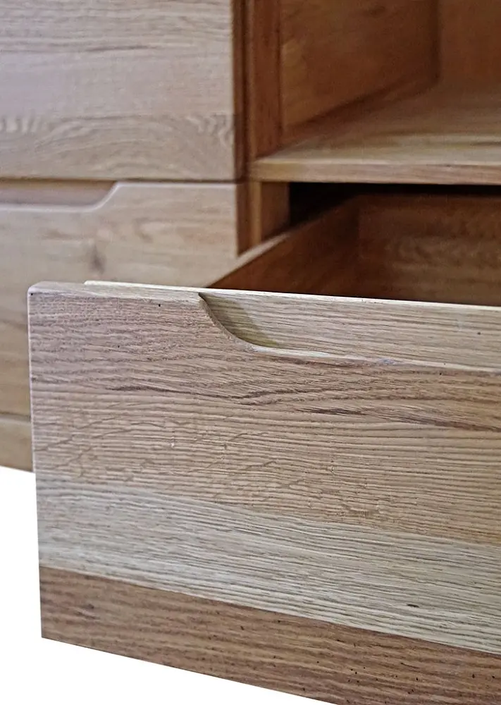 Фасадные элементы (двери, накладки ящиков, заглушки ручек) изготовлены из массива дуба.