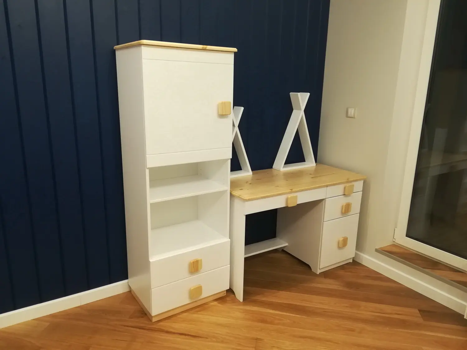 Материал — сосна, задняя стенка, дно ящиков — ДВП белого цвета. Фурнитура без доводчиков. Ручки по выбору — деревянные кнопки (по умолчанию, на фото), кружки, квадраты, сердечки, запилы.