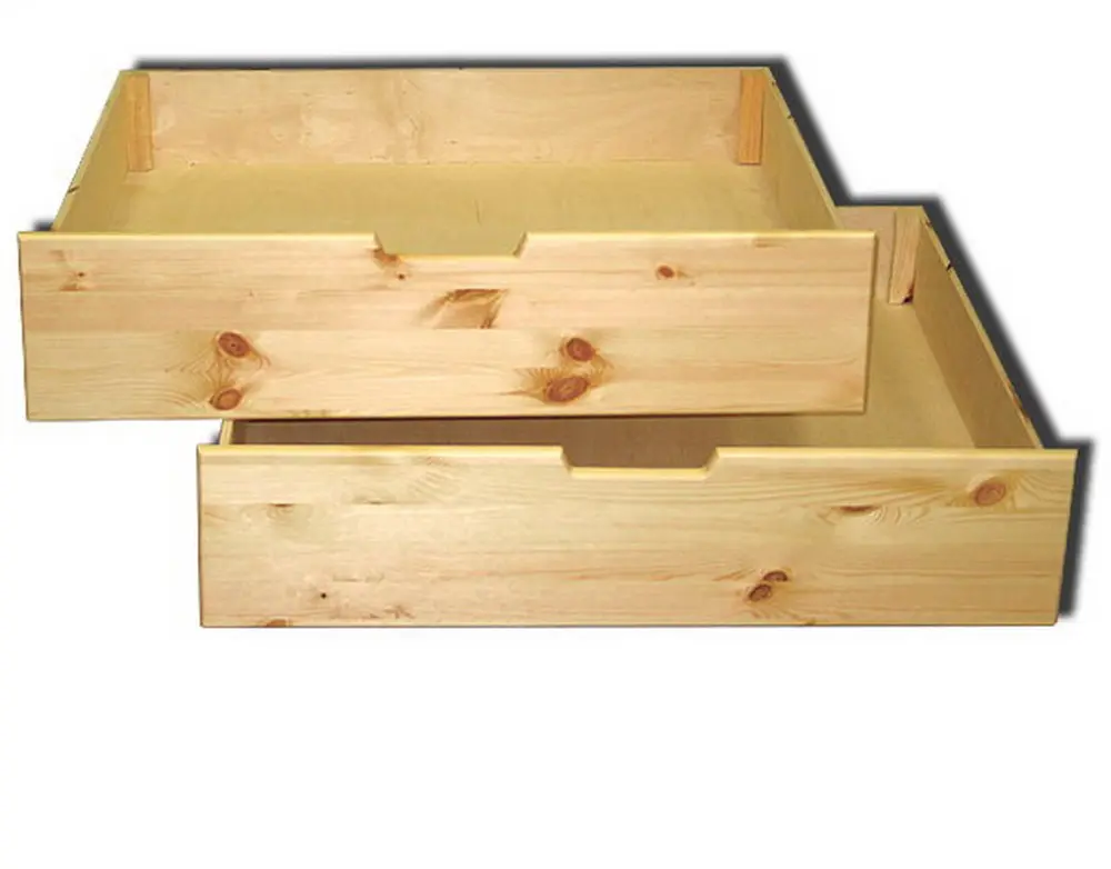 Купить ящики под кровать лучше всего сразу в комплекте с односпальными моделями Наташа, Оксана, Стандарт, (12.3.01) и другими, чьи габариты позволяют разместить такое дополнение. Для полной сочетаемости, данные напольные ящики выполняются в том же спектра цветовых решений, что и основная мебель: три варианта тонирования (медовый и ореховый оттенки, а также махагон) и три варианта покрытия лаком (прозрачные бесцветный или светло-янтарный, а также современный белый лак). Дизайн и конструкция ящиков просты и удобны: они изготовлены из массива сосны столь же высокого качества, что и кровати, для которых они предназначены; фасадная стенка немного шире боковых и задней, и имеет фигурный вырез, играющий роль ручки для выдвигания ящика.
